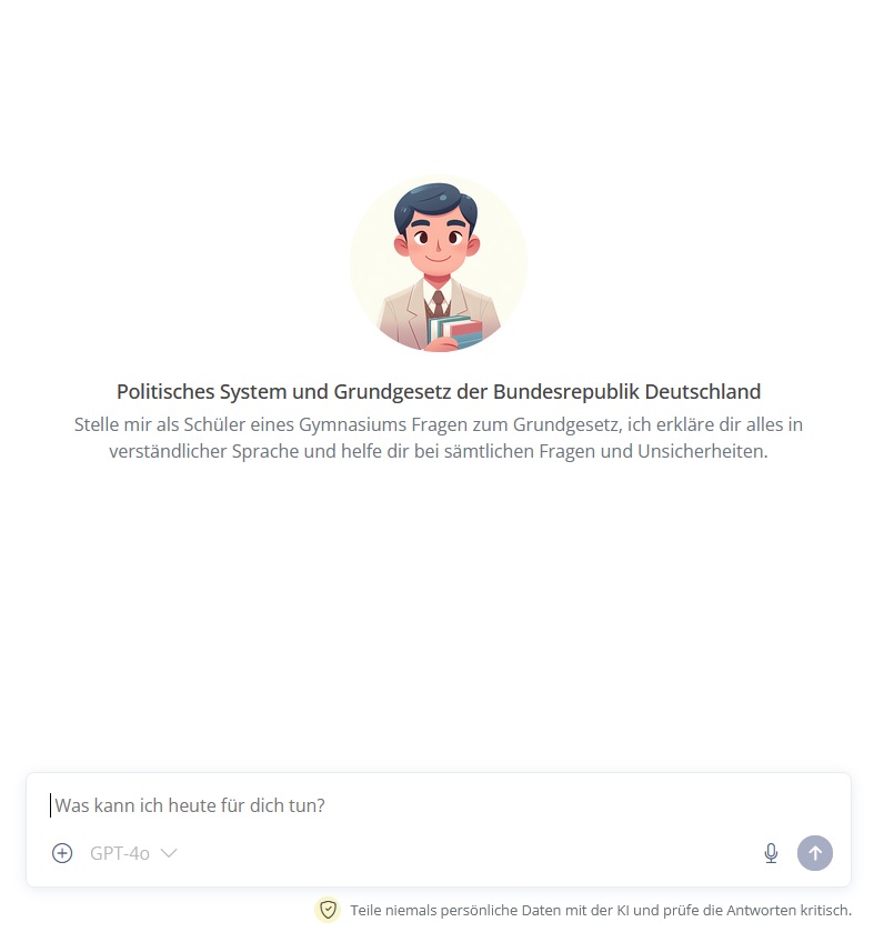 exklusiv für euch gibt es aus der Fachschaft Politik und Gesellschaft einen Chatbot, der euch alle Fragen rund um das politische System in Deutschland und die Demokratie selbst beantwortet. Er eignet sich für alle Klassenstufen und passt die Antworten auf eure jeweilige Jahrgangsstufe an. Probiert ihn gerne aus, bedenkt aber: Teilt niemals persönliche Daten mit der KI und prüfe die Antworten kritisch.