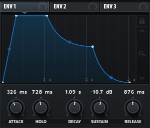 Curve, Type, Mod und Aux (von auxiliary) Source sind recht selten, weswegen ich sie in diesem Beitrag außen vor lassen werde. Dass sie doch sehr nützlich sein können, zeige ich in einem anderen Beitrag, aber zurück zum Envelope. Eine Envelope-Kurve besteht aus vier Bereichen. Der erste wird durch den Attack-Regler bestimmt. Dieser gibt die Zeit an, die der Parameter braucht, um auf 2/3 der 100% (durch Makros verstellbar) zu kommen. Der zweite wird durch den Holdregler bestimmt. Dieser gibt an, wie lange der Paramter auf 100% bleiben soll, bevor er durch den dritten Bereich modelliert wird. Dieser wird durch Decay und Sustain bestimmt. Hierbei ist Decay eine Zeitangabe und Sustain eine „Höhen-“ oder Prozentangabe. Der Decay-Regler gibt an, wie lange der Parameter braucht, um auf den vom Sustain ausgewählten Prozentsatz zu kommen. Sobald der Parameter dort angekommen, ist bleibt er dort so lange, bis die Taste losgelassen wird. Ein Envelope beginnt bei Tastendruck. Sobald die Taste losgelassen wird, geht der Parameter in den vierten Bereich. Dieser wird durch den Release-Regler kontrolliert, welcher wiederum angibt, wie lange der Parameter braucht, um wieder auf 2/3 vor 0% (mit Makros verstellbar) zu gehen. In machen Plugins gibt es auch noch ein Delay-Regler. Dieser bestimmt, wie lange gewartet wird, bis die Envelope-Kurve anfängt zu wirken.