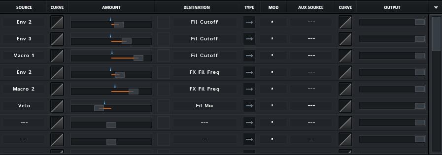 Wenn dieser Parameter nicht fest eingestellt ist, wie beispielsweise bei einem Volume-Envelope, kann man ihm meist einen Parameter zuweisen in einer so genannten FX-Matrix. Das kann sich von Plugin zu Plugin allerdings unterscheiden. Die folgende Abbildung zeigt eine solche Matrix: