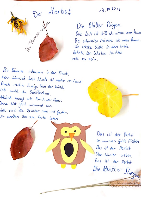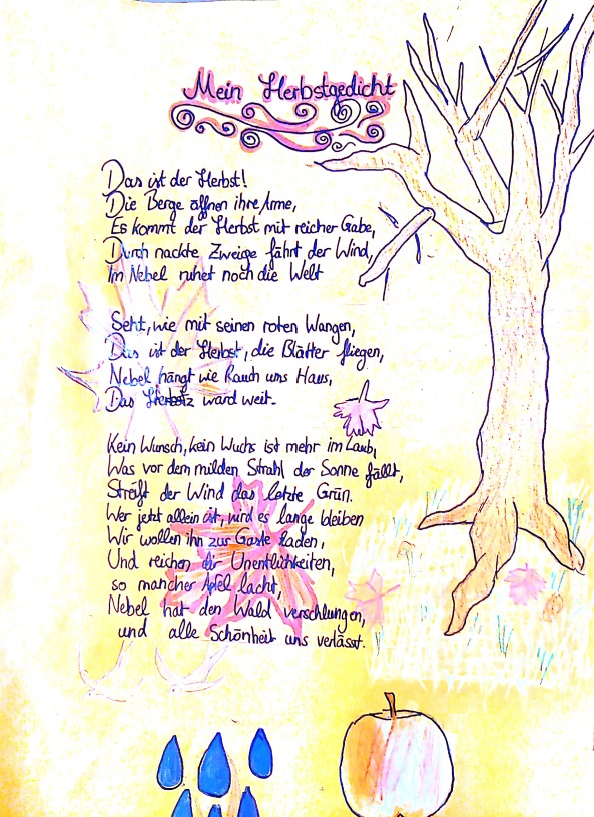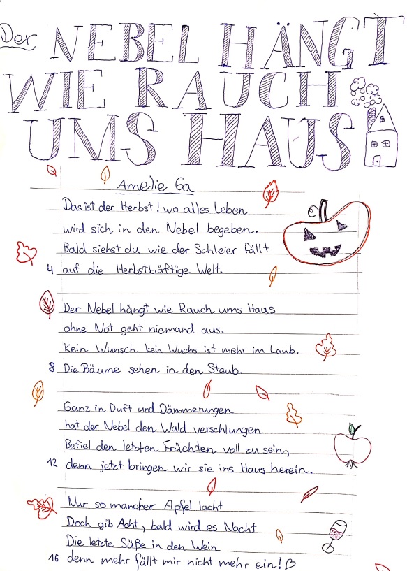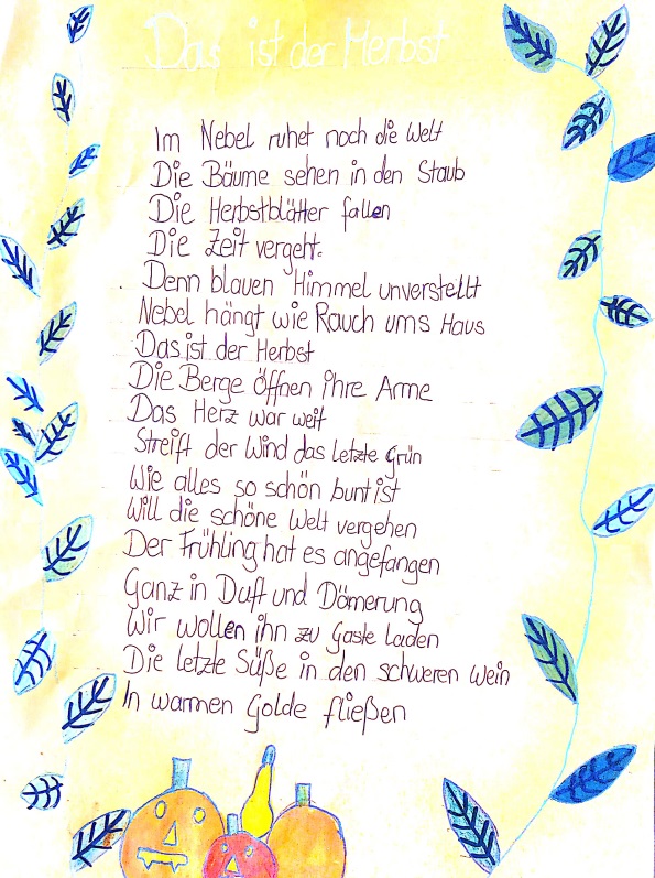 Die Klasse 6a hat im Rahmen des Deutschunterrichts eine künstlerische Collage zum Thema „Herbstgedichte“ erstellt. Vielen Dank dafür und viel Freude beim Anschauen!