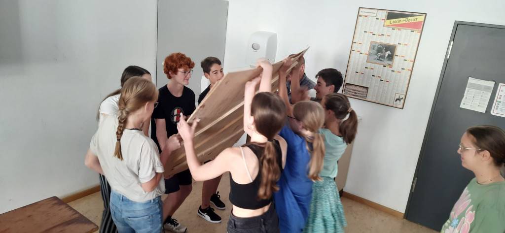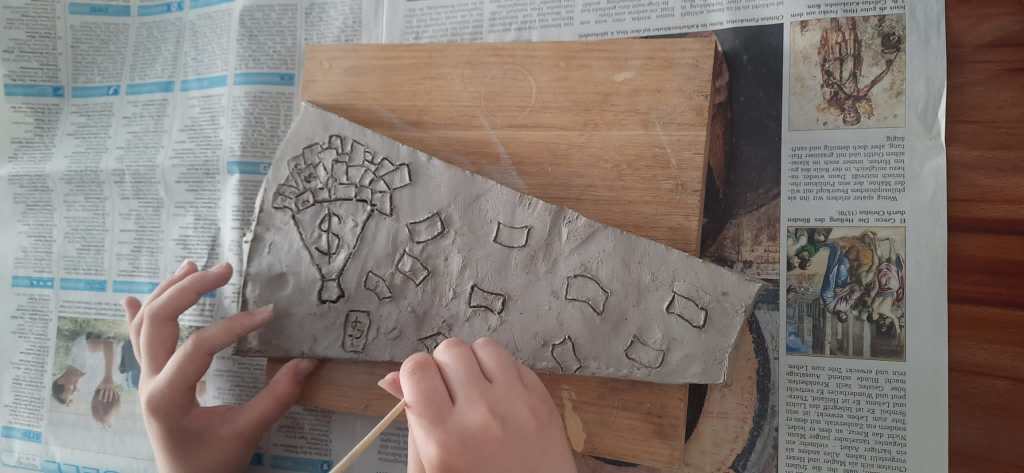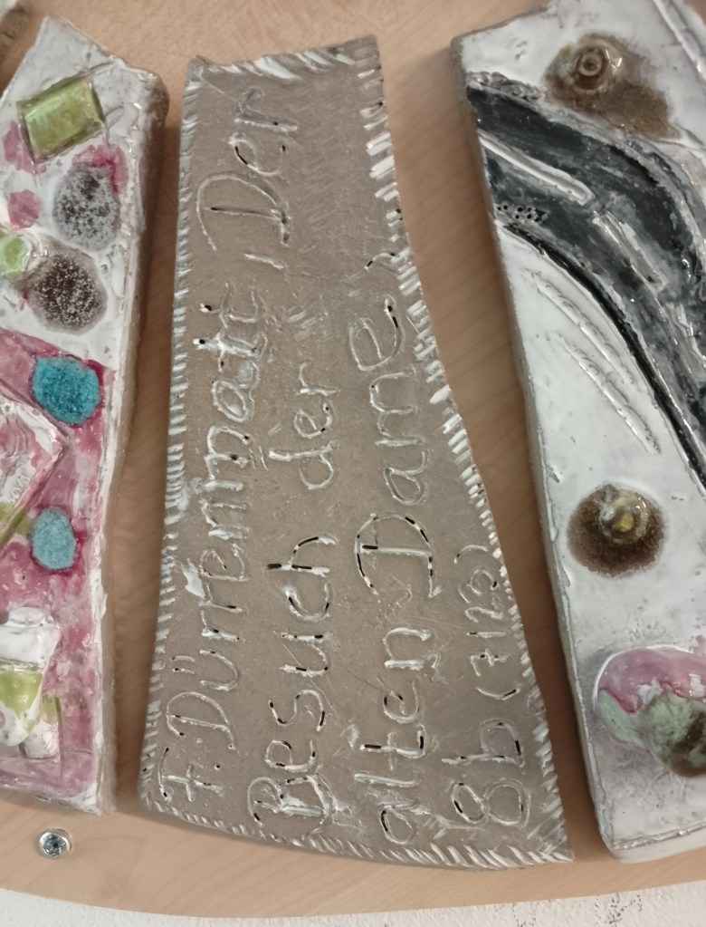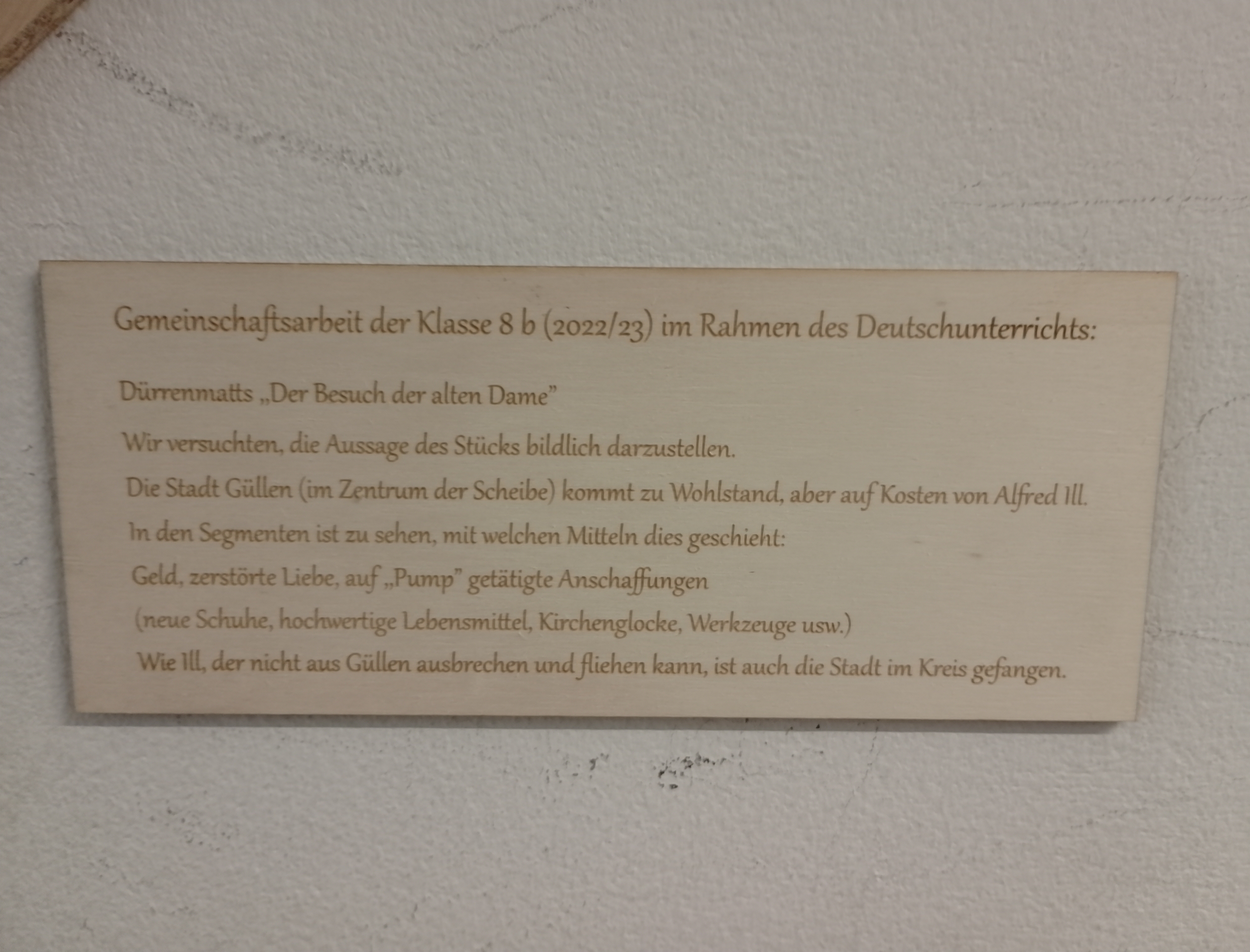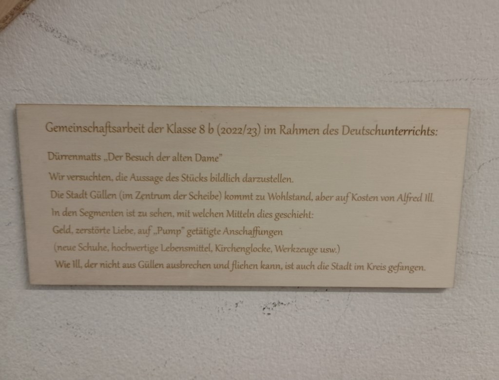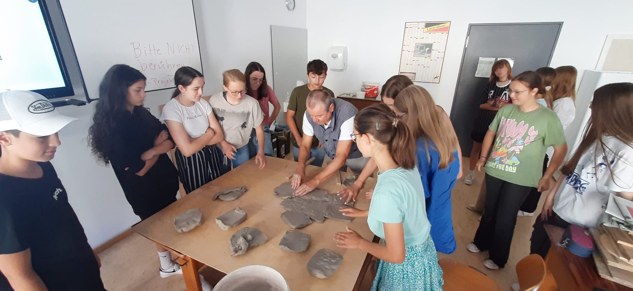 Voller Elan kam Pater Bonifatius im Schuljahr 2022/23, der unser Projekt leitete, in den Klassenraum der 8b. Gemeinsam funktionierten wir unser Klassenzimmer in einen Werkraum um und begannen damit, die Idee in die Tat umzusetzen. Im Unterricht hatten wir Dürrenmatts Buch „Der Besuch der alten Dame“ gelesen und die Geschehnisse aus dem Buch wollten wir nun mit einem Kunstwerk aus Ton vermitteln.