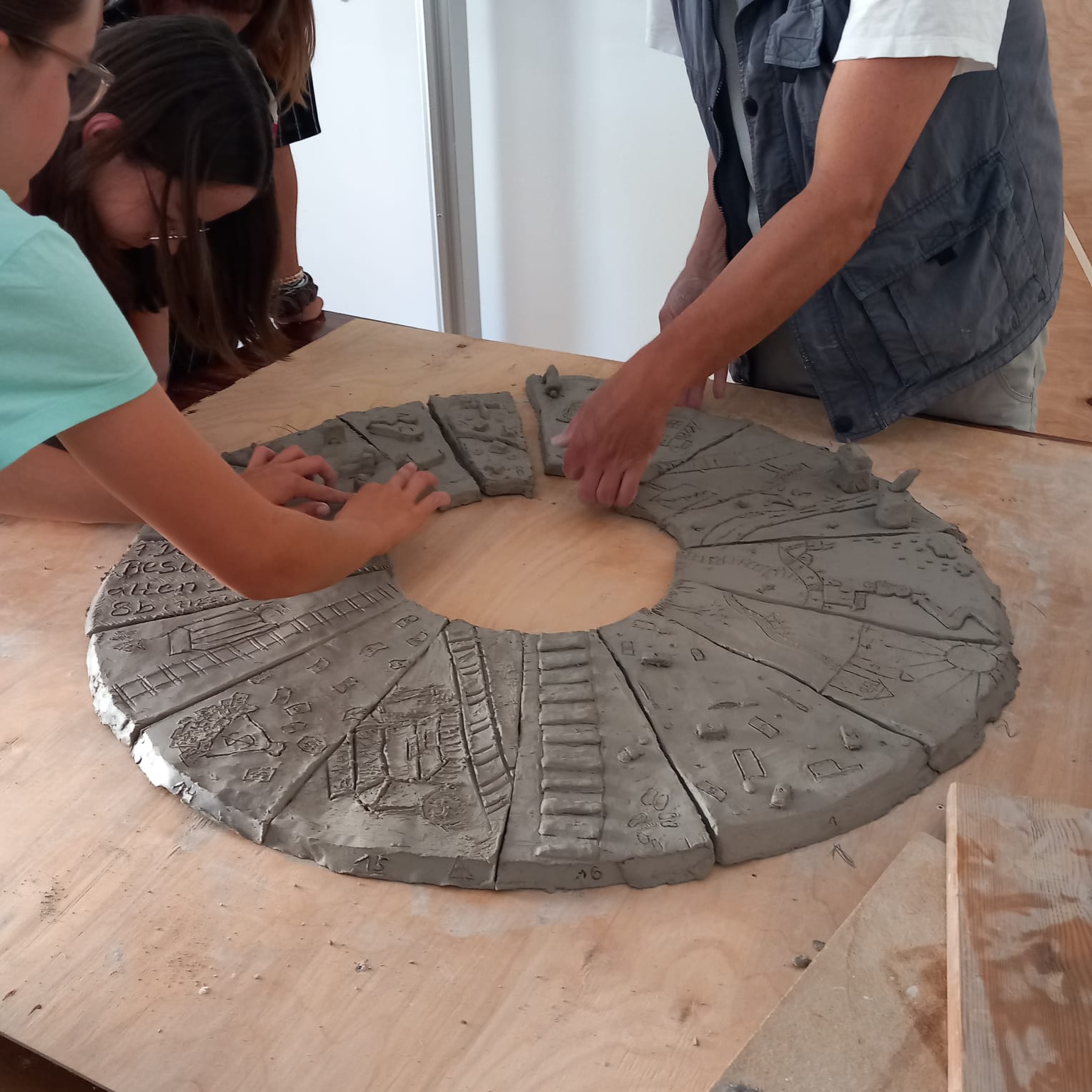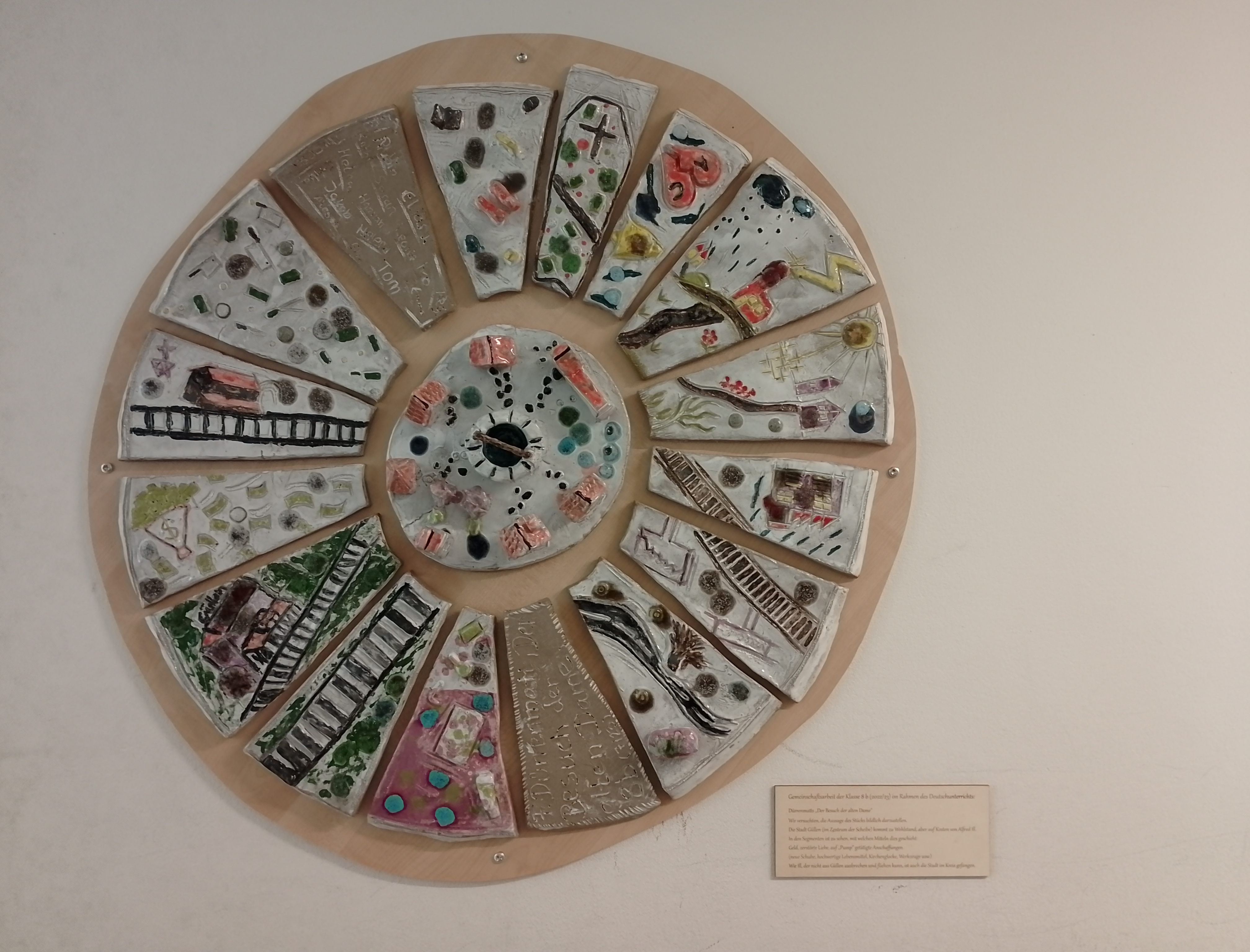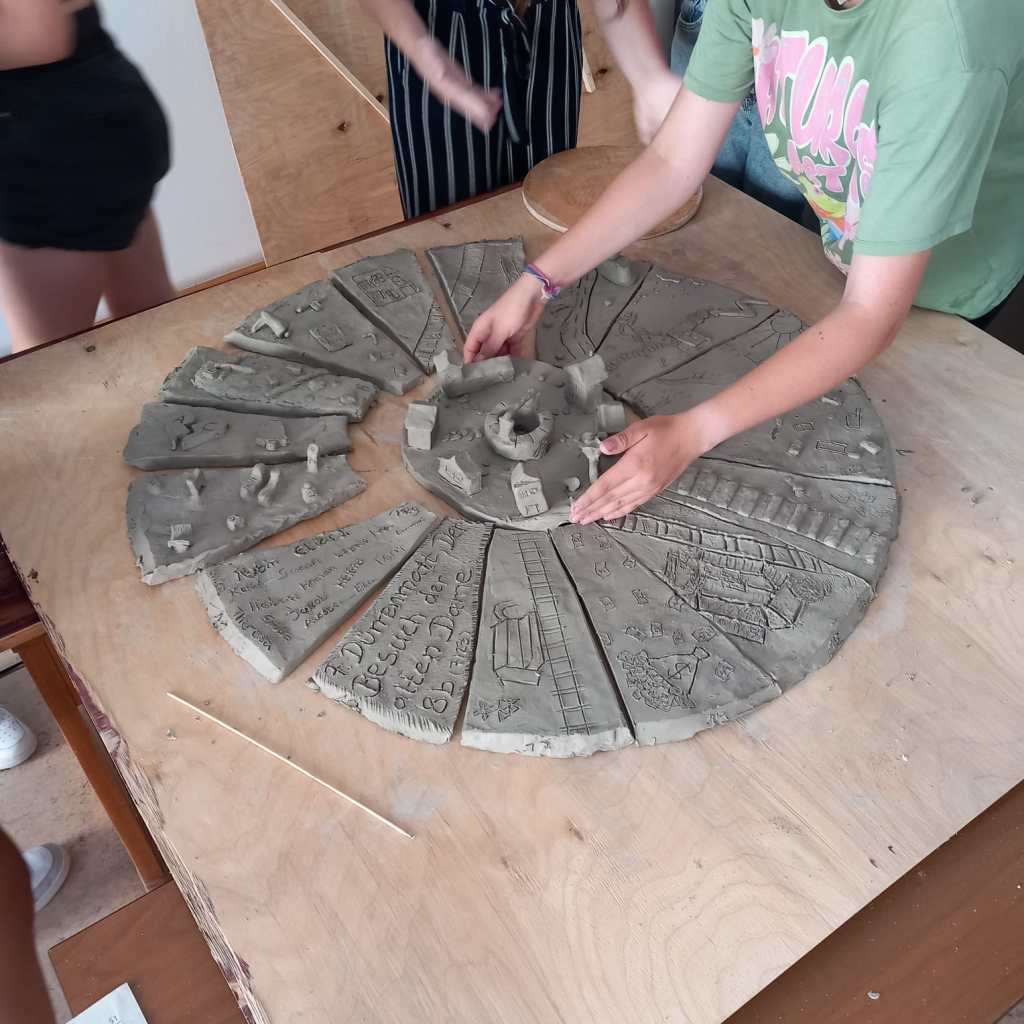 In der Lektüre ging es darum, dass das kleine, verarmte Städtchen Güllen blutbefleckt zu Geld kommt. Somit bestand unser Ziel darin, eine große Tonscheibe in Stücke zu schneiden und auf den Stücken Dinge zu modellieren, die der Stadt zu ihrem Glück verholfen haben. In der Mitte sollte dann ein kleiner Kreis sein, der das Städtchen darstellen sollte.