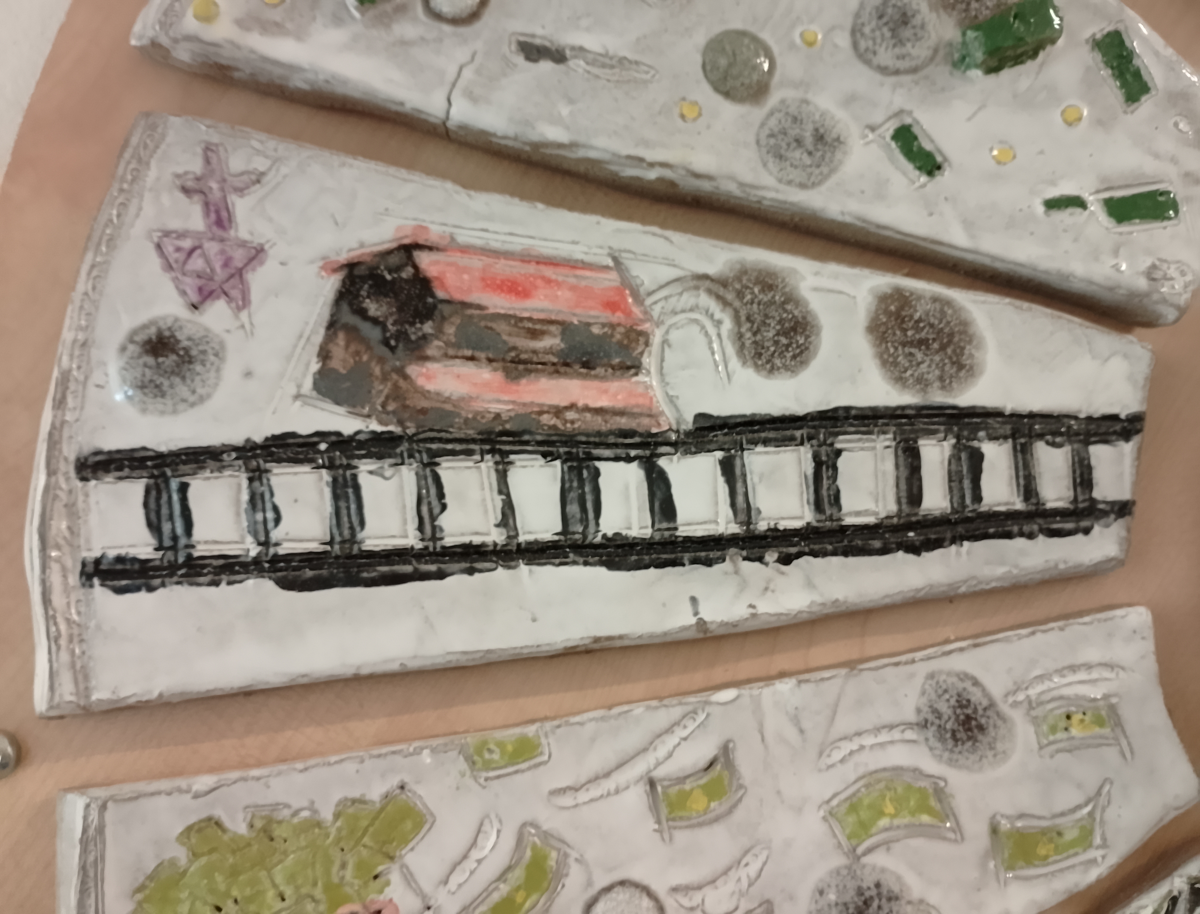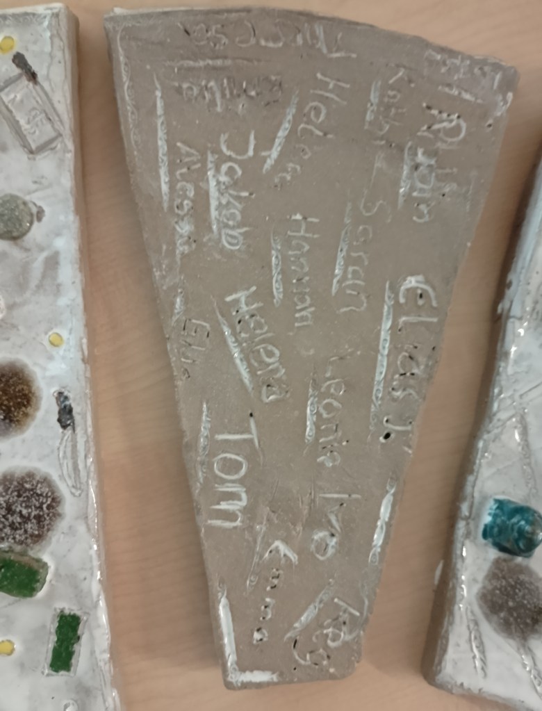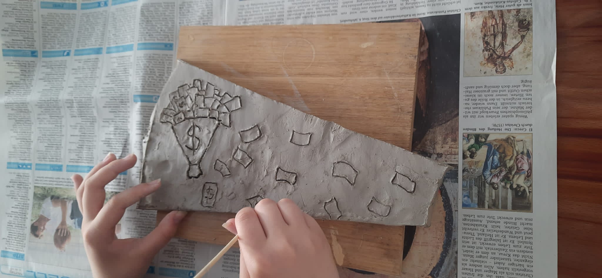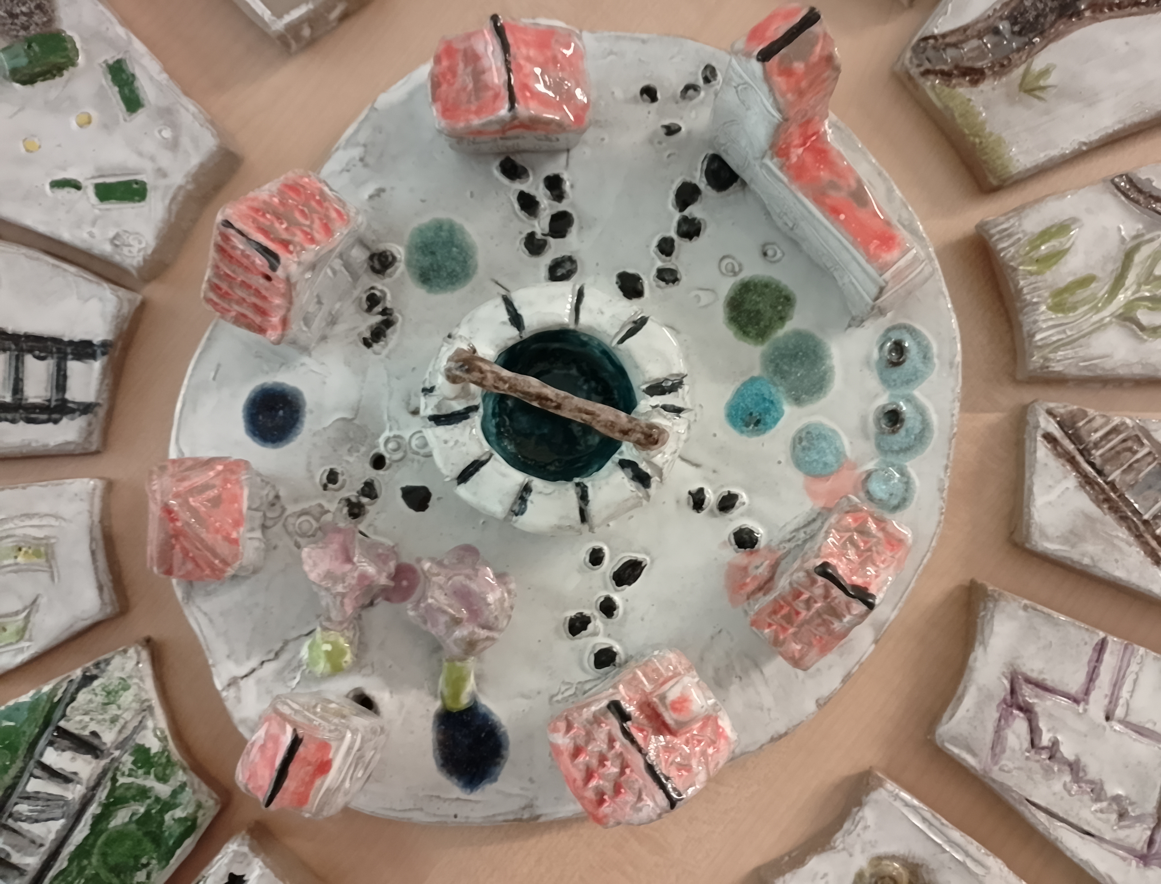 In der Lektüre ging es darum, dass das kleine, verarmte Städtchen Güllen blutbefleckt zu Geld kommt. Somit bestand unser Ziel darin, eine große Tonscheibe in Stücke zu schneiden und auf den Stücken Dinge zu modellieren, die der Stadt zu ihrem Glück verholfen haben. In der Mitte sollte dann ein kleiner Kreis sein, der das Städtchen darstellen sollte.