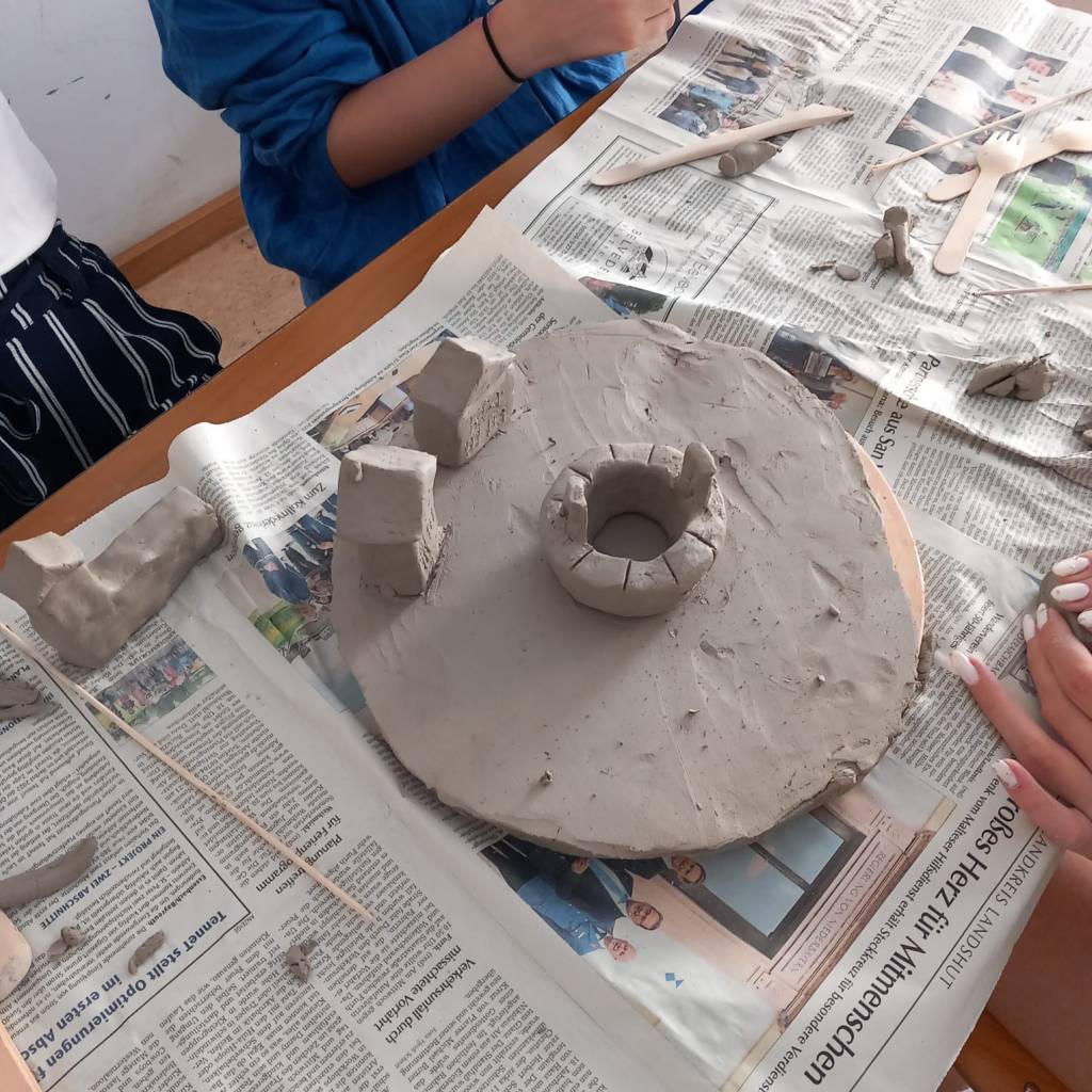 Zuerst musste eine Arbeitsfläche mit Hilfe von großen Holzplatten geschaffen werden, auf denen die von Pater Bonifatius mitgebrachten Utensilien ausgebreitet wurden. Die Tonklumpen mussten in dünnere Platten zurechtgeschnitten werden. Dies geschah mit zwei Holzstäben und einem Draht. Zwischen die Stäbe wurde der Klumpen gelegt und darüber der Draht gespannt. Dann wurde er durch den Ton gezogen und schnitt ihn somit in zwei Hälften, die dann nebeneinander zu einem Kreis gelegt wurden. Im nächsten Schritt wurden die Platten verbunden und die Fläche glatt gestrichen. Jetzt war Teamarbeit gefragt, denn auf der anderen Seite waren noch einige Ritzen, die wir schließen mussten. Wir legten noch eine Holzplatte auf die riesige Tonfläche und gemeinsam hoben wir die Platten hoch, drehten sie um und legten sie wieder auf unseren Arbeitsplatz. Dann schlossen wir die Lücken. So ganz perfekt war die Scheibe allerdings noch nicht und um sie exakt rund zu bekommen, bauten wir aus einer Schnur, einem Nagel und einem Messer schnell eine Art Zirkel, um vorzuzeichnen, was dann etwas schräg weggeschnitten wurde. Nachdem das erledigt war, strichen wir die Fläche noch glatt und begannen damit, den Kreis in 16 Stücke zu schneiden und in der Mitte noch eine Runde Platte für die Stadt übrig zu lassen. Jeder konnte nun seiner Fantasie freien Lauf lassen und seine Ideen, die er in der Stunde davor gesammelt hatte, umsetzen. Mit einigen Tipps von Pater Bonifatius gelang uns das dann auch sehr gut und wir konnten das Puzzle wieder zusammensetzen. Wir waren alle sehr zufrieden, denn wir hatten es nach anfänglichen Schwierigkeiten doch gut hinbekommen, die Figuren nicht zu detailliert zu gestalten und dennoch zu vermitteln, was gemeint war. Am Ende bedankten wir uns nach dem Aufräumen mit einem kleinen Präsent noch bei unserem Unterstützer, der sich sichtlich darüber freute.
