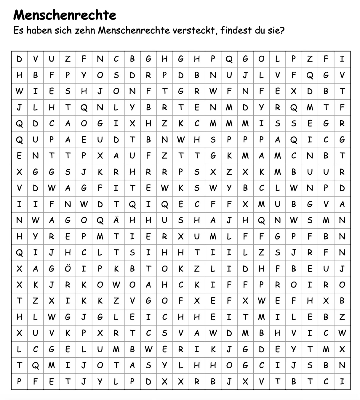 Teste dein Wissen: Suchsel zu den Menschenrechten! Wie gut kennst du die wichtigsten Begriffe rund um Menschenrechte? Unser Suchsel enthält zehn Begriffe. Findest du sie alle? Ein spannender Weg, um dein Wissen zu überprüfen und die Menschenrechte besser kennenzulernen!