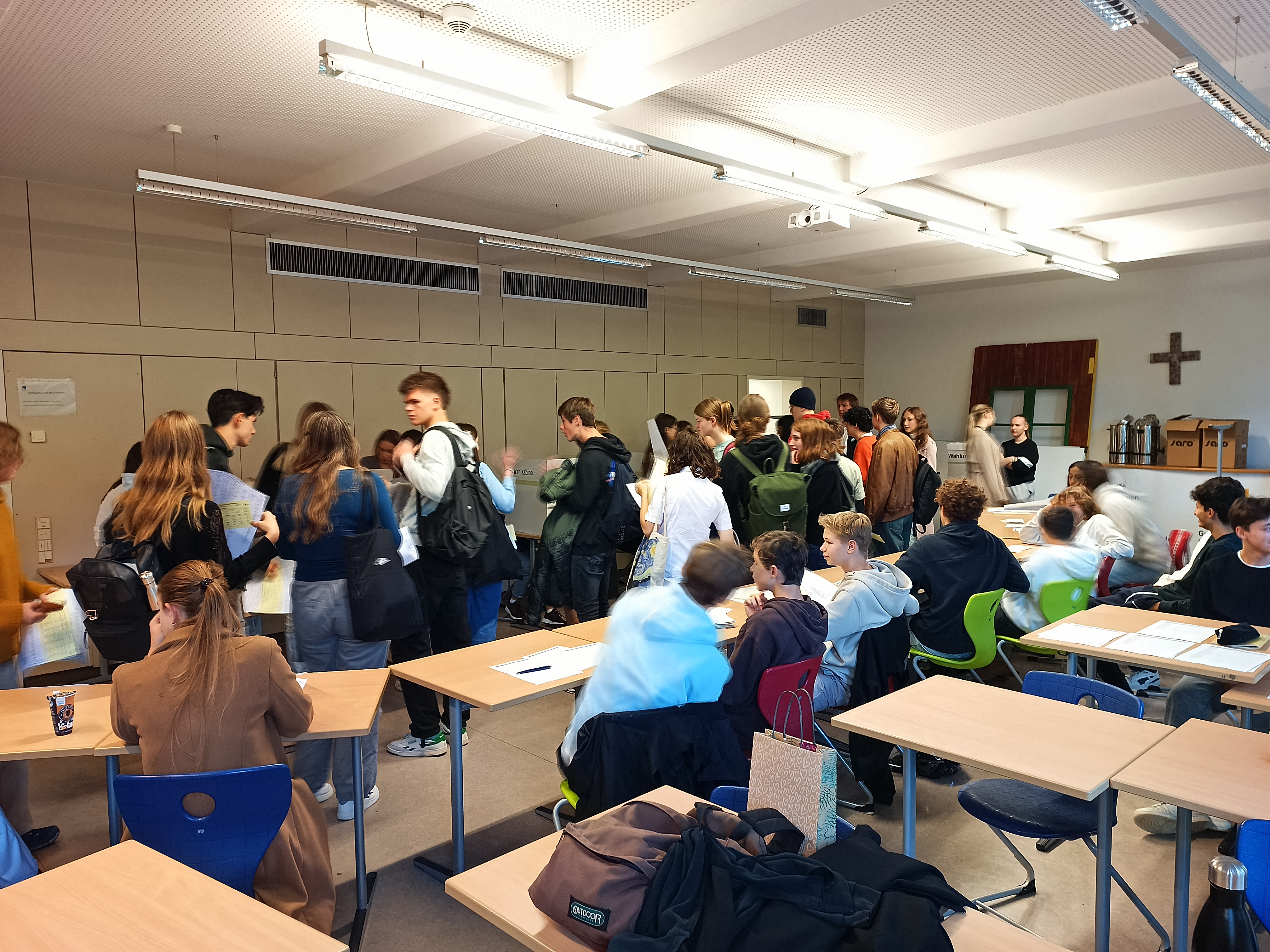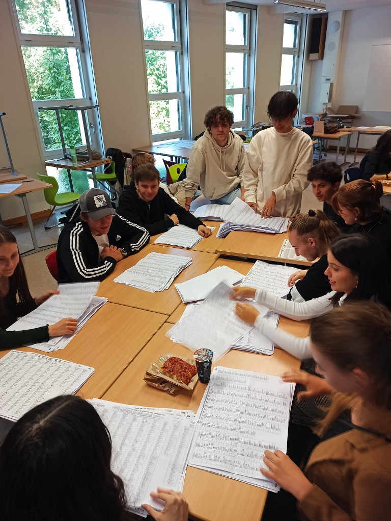 So leer war der Wahlraum am Freitag nur seltenUnsere Schulleiterin Frau Weger im Gespräch mit Schülern der Klasse 10dAuch die Q12 kam zur WahlDie 10d beim Auszählen der ErststimmenJede Auszählung wurde doppelt überprüftDie 10d beim Auszählen der Zweitstimmen
