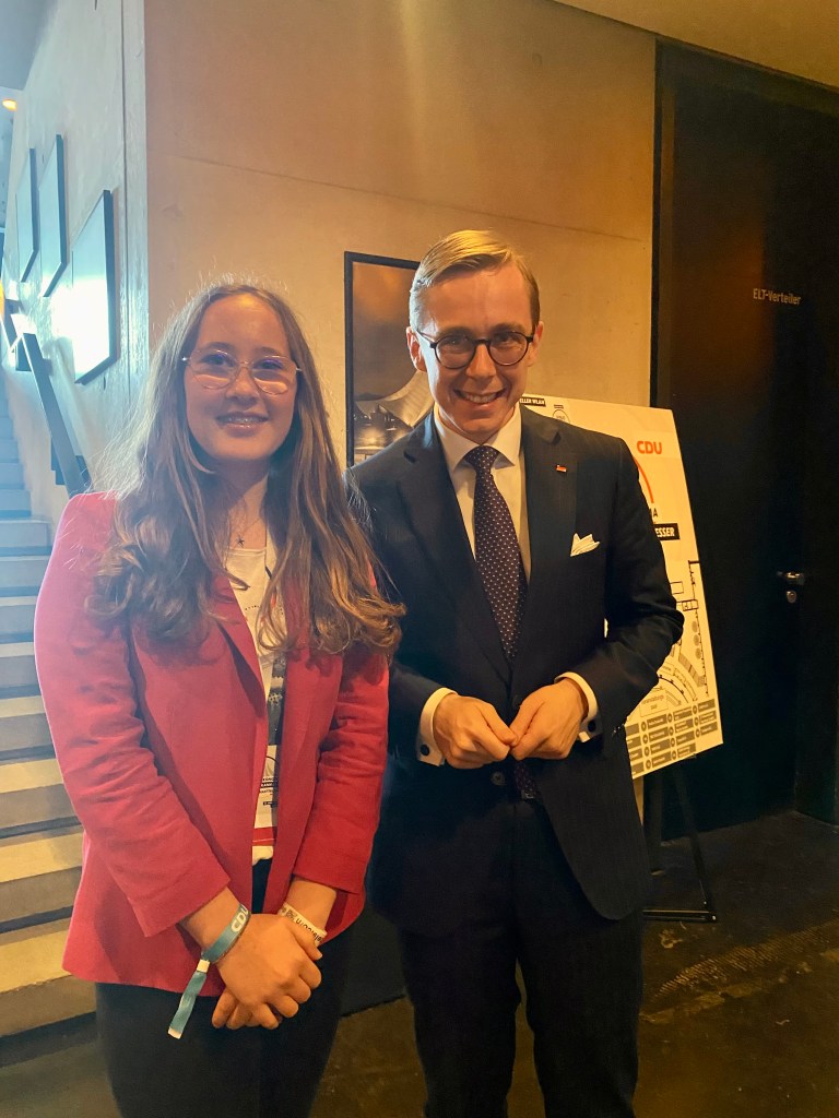 Der nächste Tag begann früh und so standen wir bereits um 8 Uhr in der Akademie der Konrad-Adenauer-Stiftung. Dort gab es einen Vortrag zur Übersetzung von Erkenntnissen der Wissenschaft in politisches Handeln. Anschließend gaben uns ehemalige Stipendiaten der Stiftung sowie CEOs verschiedenster Firmen Einblick in ihre Lebenswege. Bei Kaffee und Kuchen hatten wir im Anschluss die Möglichkeit, uns mit den Panelteilnehmerinnen und diversen Abgeordneten auszutauschen. Nach dem Imbiss stand ein weiteres Highlight auf dem Programm: der Fraktionsvorsitzende Friedrich Merz hatte sich für eine Diskussions- und Fragerunde Zeit genommen. Einen kurzen Moment zum Durchatmen verschaffte ein dreißigminütiger Spaziergang zum Deutschen Bundestag, bei der uns die stellvertretende Generalsekretärin der CDU Deutschland, Christina Stupp MdB, begleitete. Zum Lunch ging es ins Marie- Elisabeth-Lüders-Haus, in dem uns erneut ein riesiges Buffet geboten wurde und wir viel Zeit zum Austausch mit den Politikern hatten. An das Mittagessen schloss sich direkt die Führung durch den Bundestag und das Paul-Löbe-Haus an, gefolgt von unterschiedlichsten Seminaren und politischen Debatten. Das offizielle Programm endete um 16 Uhr mit einer Verabschiedung durch Dorothee Bär, stellvertretende Fraktionsvorsitzende der CDU Deutschland. Allerdings fand am selben Tag der Zukunftskongress statt, zu dem ich spontan eingeladen wurde. Unter dem Hashtag #wirtschafftklima wurden Diskussion und Präsentationen über verschiedenste Themen gehalten und beispielsweise das Wasserstoffauto der BMW AG vorgestellt. Der Kongress im Berliner Tempodrom gab mir außerdem die Möglichkeit, Gespräche mit Phillip Amthor sowie Jens Spahn zu führen. Nadine Schön, auch stellvertretende Vorsitzende, lud mich netterweise noch zum Abendessen ein und so fiel ich um ein Uhr nachts todmüde ins Bett.